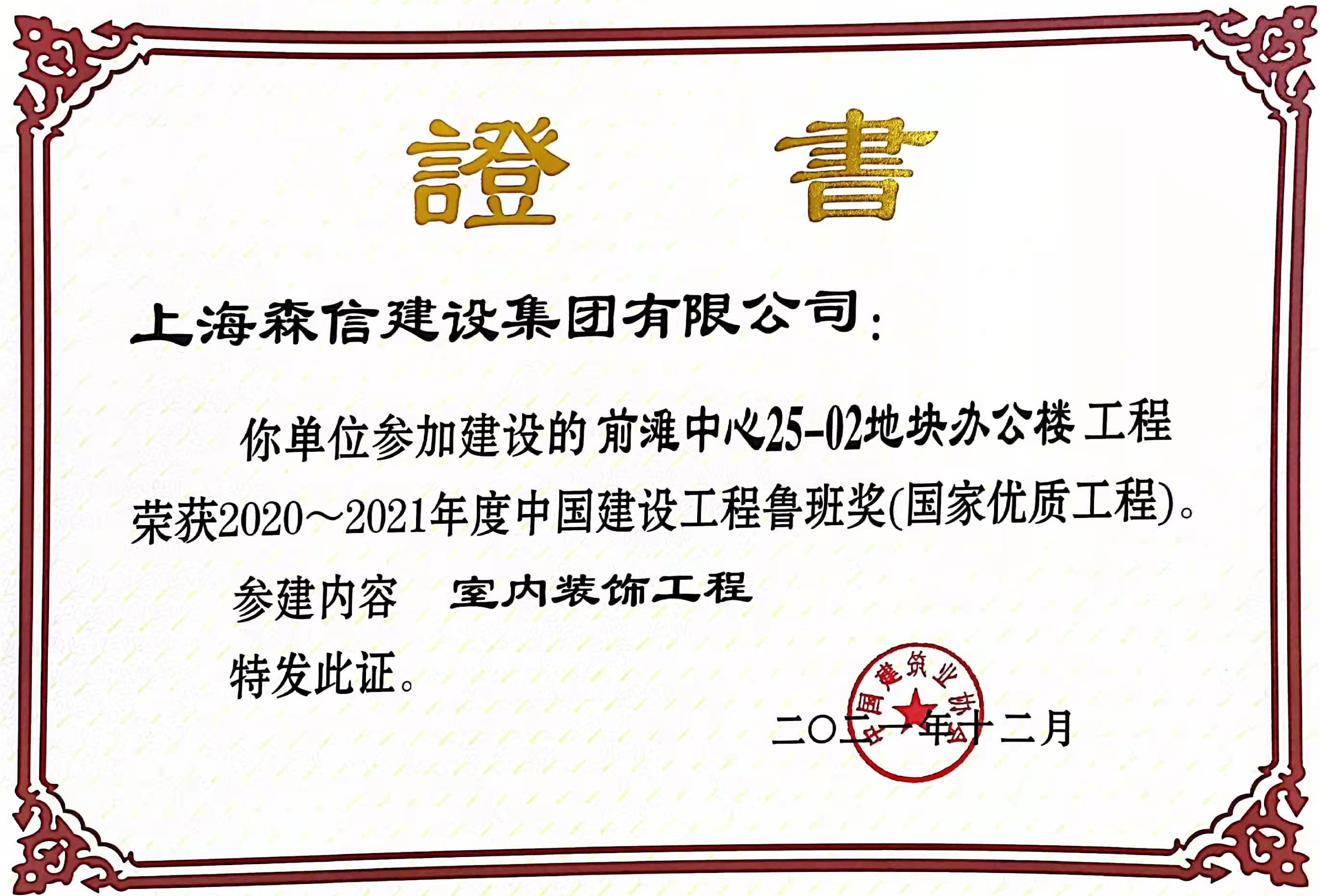 近日,中國建筑業(yè)協(xié)會公布了“2020-2021年度中國建設(shè)工程魯班獎(國家優(yōu)質(zhì)工程)”的獲獎工程和獲獎單位。上海森信建設(shè)集團(tuán)有限公司參建的國電綜合業(yè)務(wù)樓工程和前灘中心25-02地塊辦公樓工程雙雙獲獎。